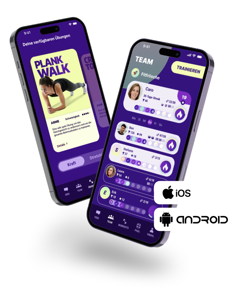 Jeder Trainingstag beginnt um 00:00 morgens und endet um 23:59 nachts. Dadurch können sowohl die Nachtschwärmer als auch die Frühaufsteher zur individuell besten Tageszeit entspannt trainieren. Wenn du trainieren möchtest, klickst in der App einfach auf den entsprechenden Button und startest dein tägliches Workout. Das Ergebnis taucht dann automatisch in deiner Team-Übersicht auf.