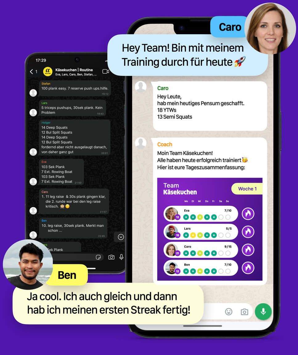 Es gibt (1) eine Gruppe für das tägliche Teilen der Trainingsergebnisse, in der auch vom Coach jeden Tag die grafische Wochenübersicht gepostet wird, (2) eine reine Chat-Gruppe für dein Team zum Austausch (optional), (3) den Pool und (4) den direkten Chat zwischen dir und deinem Coach, in dem du individuelle Fragen stellen kannst und deine Tutorialvideos und weiteren Inhalte geschickt bekommst. Das hört sich jetzt vielleicht erst mal nach viel an, aber du wirst vermutlich die meiste Zeit nur die Gruppe mit den Trainingsergebnissen nutzen, es sei denn dein Team ist sehr gesprächig :)