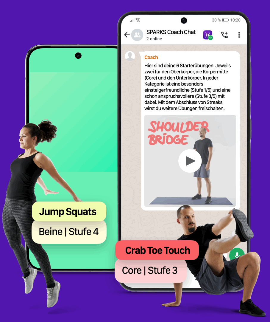 Für das Trainieren mit SPARKS steht dir und deiner Gruppe ein Coach, d.h. ein persönlicher Trainer zur Verfügung. Er hilft dir bei Fragen zum Ablauf, bei der Auswahl der passenden Übungen und er motiviert dich und dein Team zusätzlich beim Dranbleiben. Unsere Coaches sind ausgebildete Fitnesstrainer und Motivationsexperten und für alle Fragen in und um SPARKS die perfekten Ansprechpartner.
